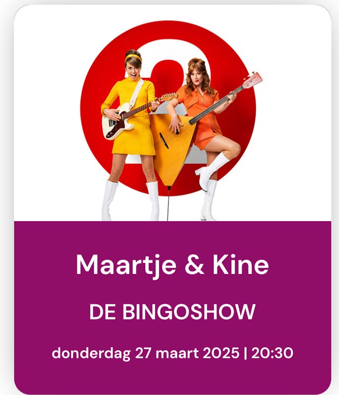 De muzikaalste bingoshow van Nederland, met blinkende ballen en prachtige prijzen! Na vier theatershows en het winterspektakel ‘SNEEUWBEESTEN’ gaan Maartje en Kine terug naar de kern: BINGO. Het leven is een loterij: je kunt geluksnummers trekken of het ongeluk treffen – en niemand die het van tevoren weet. Wat je wél zeker weet: vanavond kijk je naar een muzikale bingoshow met oude en nieuwe nummers uit het rijke repertoire van deze multi-instrumentalisten. Moeiteloos leiden Maartje en Kine je van Brahms naar beatbox, van Franz Schubert naar Frans Bauer. Ondertussen houden ze meer muzikale ballen in de lucht dan de bingomachine uitspuwen kan. Verwacht een warmbloedig liedjesprogramma over grote (verloren) liefdes, hartstochtelijke dagdromen maar ook met kolderieke meezingers.