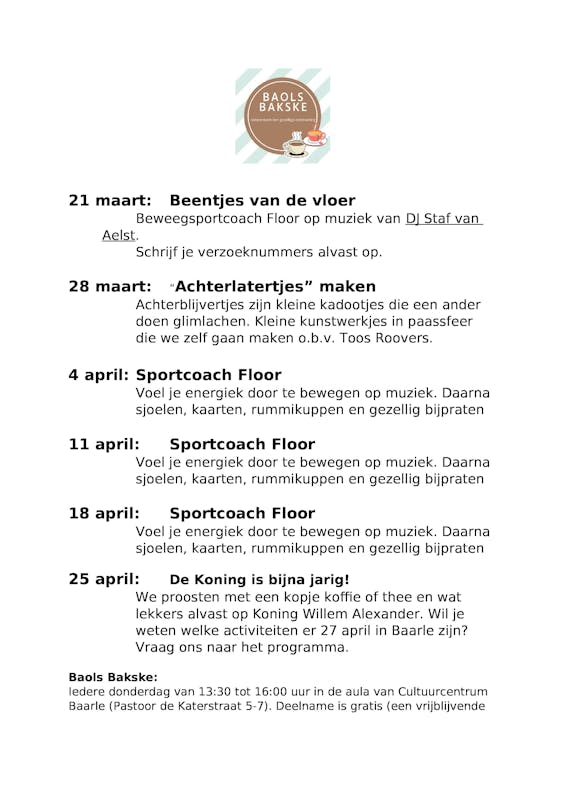 Gezellig Programma In mei nodigen we je uit voor een leuk programma op donderdagmiddag. Voel je vrij om deel te nemen aan het Baols Bakske! Ontmoeting en Activiteiten Het...