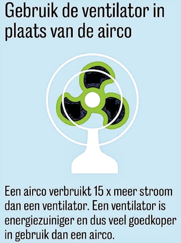 - Zet de ventilator of airco niet continu aan. Gebruik ze alleen op de momenten dat u rust neemt of slaapt. Als u toch de deur in en uit loopt verliest u erg veel energie. En dat is zonde.