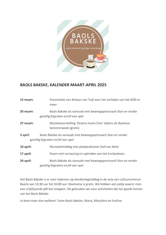 Het Baols Bakske verwelkomt iedereen elke donderdag van 13:30 tot 16:00 uur in het cultuurcentrum Baarle. Deelname is gratis, (een vrijblijvende kleine vrijwillige gift in onze potje is welkom. Met deze opbrengsten ondersteunen we leuke activiteiten voor het Baols Bakske).