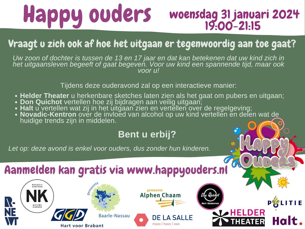 Omdat veel ouders dit soort vragen hebben, willen wij (preventie Novadic-Kentron, Gemeente Alphen-Chaam & Baarle-Nassau, GGD, Politie, Halt, Don-Quichot, R-Newt en De la Salle) u uitnodigen om deel te nemen aan de interactieve Happy Ouders avond. Het onderwerp veilig uitgaan willen we deze avond samen met u verkennen.