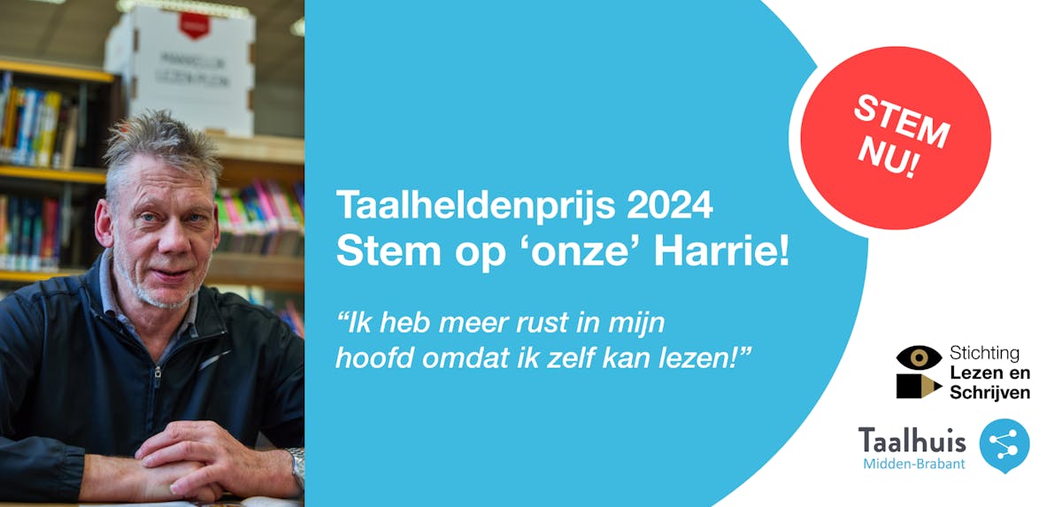 Samen met Harrie zijn ook in 9 andere provincies Taalhelden verrast. Met z’n allen gaan zij naar de landelijke Taalheldenprijs. Een deskundige jury bepaalt de Taalheld 2024. Maar alle 10 genomineerden maken ook kans op de Publieksprijs. Van woensdag 8 mei tot en met donderdag 13 juni kan iedereen in Nederland stemmen op zijn favoriete genomineerde. Dat kan op de website www.taalheld.nl.