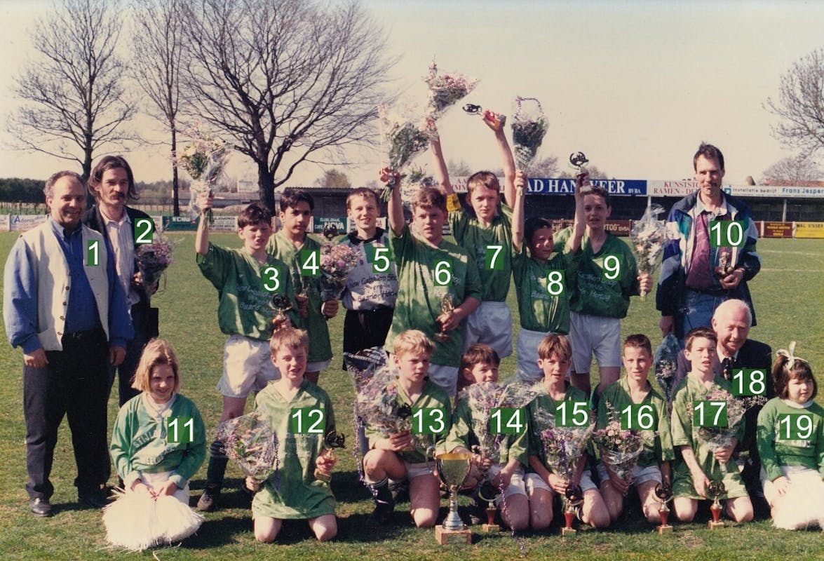 Wij weten wel de namen van de sponsor en trainers. Dat zijn links Ad Haneveer en Mark Van Haeren en rechts Johan Nooijens en Jan Akkermans. Weet u nog wie deze voetballers zijn? Misschien herkent u hier iemand van of staat u er zelf bij. We willen het graag weten.