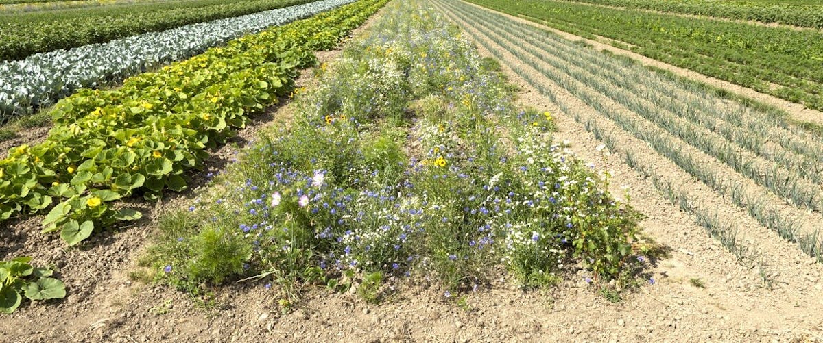 Dan stappen we door het dorp richting Boskobe. Wouter Storm zocht op allerlei plaatsen in Nederland naar een mooi lapje grond. Natuurlijk vond hij dat in Baarle, net buiten de randweg en grenzend aan een heel ruime streek die in agrarisch gebruik is. Hier is hij op weg om – hoe zal ik het noemen – ‘experimentele teelten’ uit te gaan voeren. Valt daar de term ‘strokenteelt’?