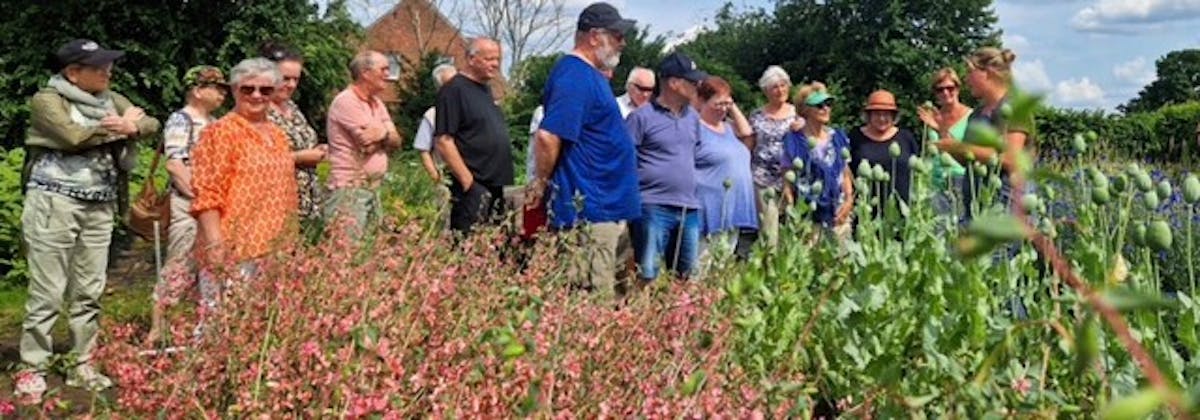 Allereerst fietsten we naar een pluktuin in de Oordeelsestraat. Het bleek een echte bloemenboerderij te zijn, Baalse Hoef genaamd. Vanaf de weg zie je niet hoe diep en hoe groot deze tuin is. Van oudsher gaat mijn voorkeur naar allerlei bloemen, ook al staat het langs de kant van de weg, zoals een klein akkerviooltje, grasklokje of boerenwormenkruid. Nou, ik heb mijn ogen uitgekeken. Wat een bloemenpracht, heel zorgvuldig opgebouwd, met een enorme knowhow van bemesting, zaaien, verplanten, aangepast aan de diverse seizoenen. De liefde voor de bloemen spatte er in heel de rondleiding door Danique vanaf! Namen van bloemen ga ik hier niet noemen, nog wel even naar de dahlia’s. Mijn gedachten gingen naar mijn moeder, die ook zo van veel dahlia’s in allerlei soorten in haar tuin hield. Echter een fractie van de drieduizend hier. ‘Die wil ik nog eens zien bloeien in augustus’, hoorde ik een deelneemster zeggen. De cake en de drankjes maakten dit bezoek helemaal compleet. Een bijzonder hartelijke ontvangst.