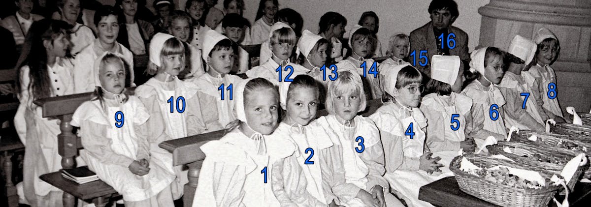 Op deze foto uit 1993, gemaakt door Gerda Norbart, zitten de bloemenbruidjes klaar in de kerkbanken. Achteraan zit juffrouw Versmissen en nummer 16 is meester van Gils van de lagere school van Baarle-Hertog. Maar weet u nog wie deze wit geklede bloemenbruidjes zijn. Of was u een van de deelnemers en heeft u daar nog een leuke herinnering aan? Reageer dan op dit bericht of stuur een mail naar onderstaand adres. Ook als u bij een andere foto op de beeldbank nog ontbrekende namen weet mag u een reactie sturen, vermeld dan wel graag het nummer bij de foto. Reacties bij deze foto graag naar onder nummer: #061760