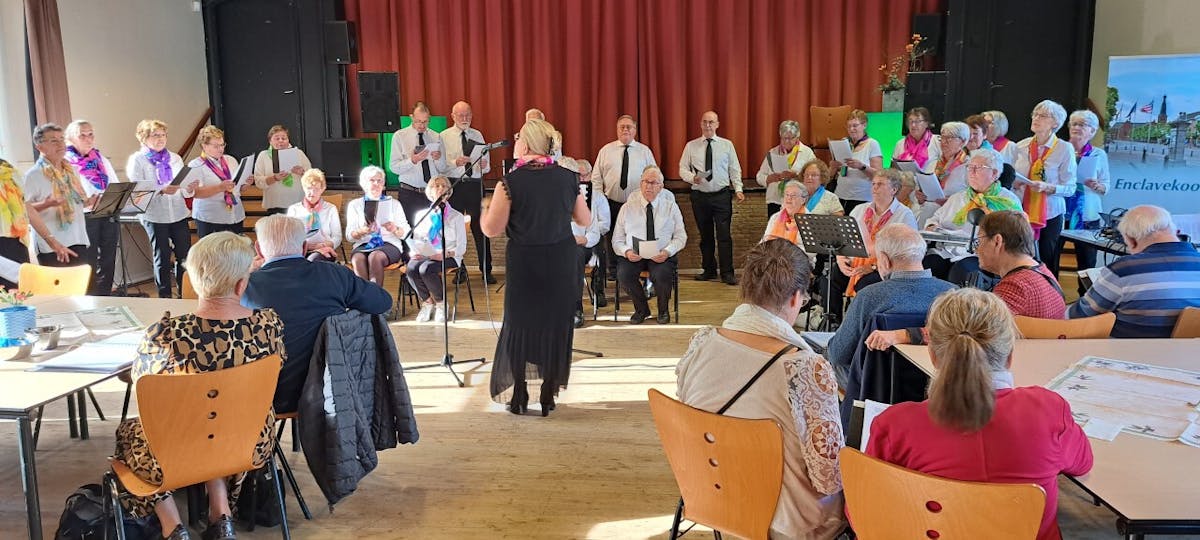 De tafels waren nog maar net afgeruimd, toen de leden van het Enclavekoor al zingende binnenkwamen. Wat een mooie opkomst en wat een mooi optreden! Liedboeken waren voorzien zodat mensen lekker mee konden zingen als ze daar zin in hadden.