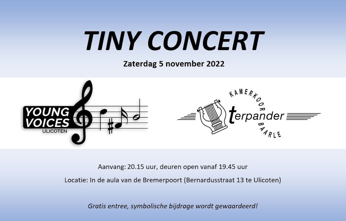 Zaterdagavond 5 november geven Young Voices Ulicoten en Kamerkoor Terpander een Tiny Concert in de Bremerpoort te Ulicoten. Van harte welkom om te komen kijken en luisteren!