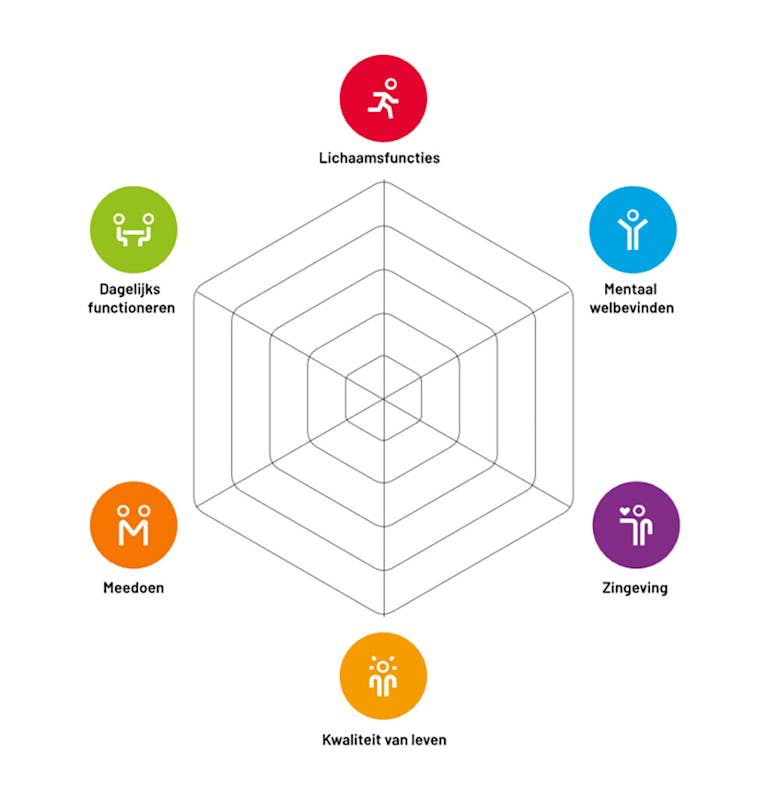 De zes dimensies van Positieve gezondheid zijn uitgewerkt in een spinnenwebdiagram. Met dit spinnenweb kun je zelf je gezondheid in kaart brengen. Als je per onderdeel inzicht hebt in hoe het met je gaat, kun je vervolgens nagaan wat voor jou belangrijk is en waar je iets zou willen veranderen.